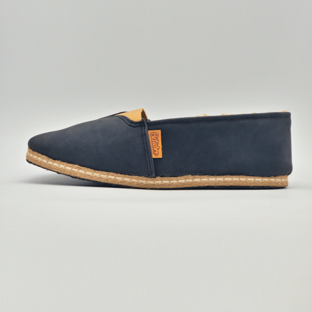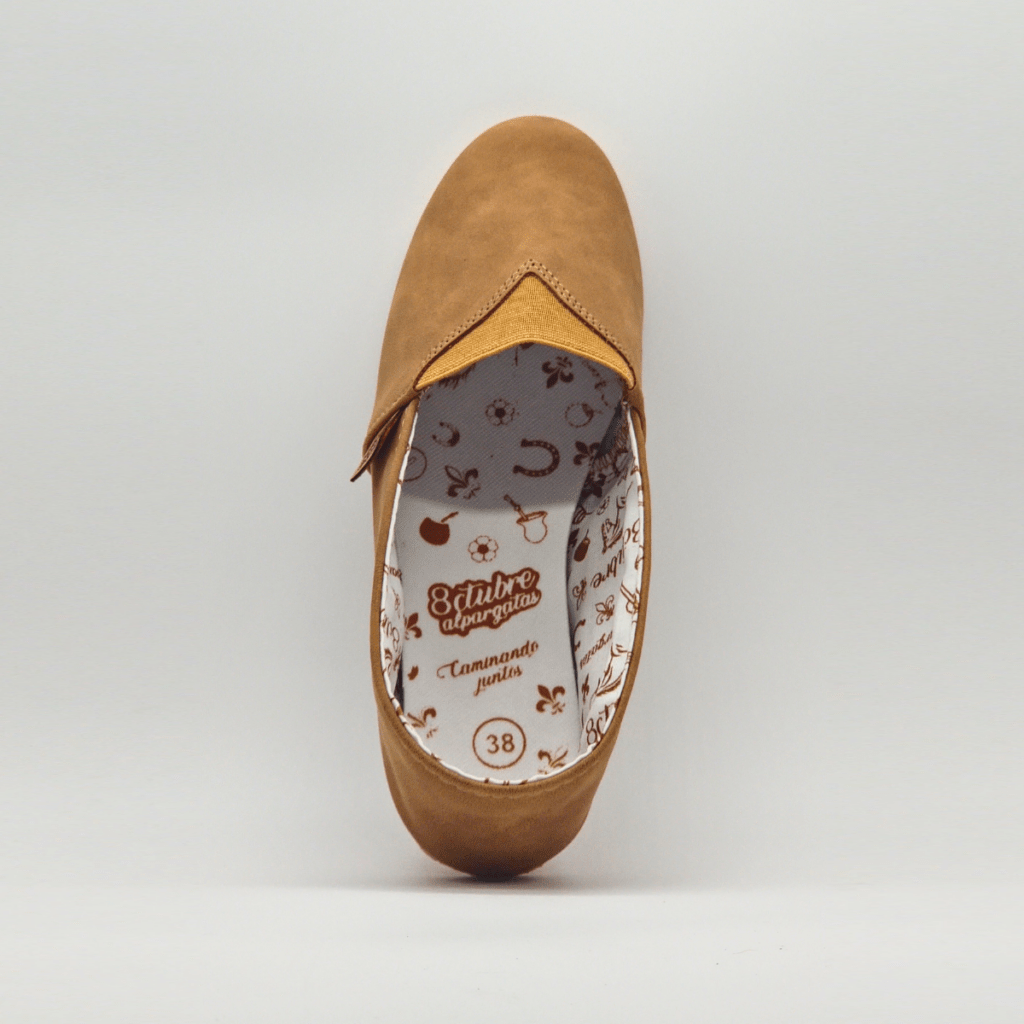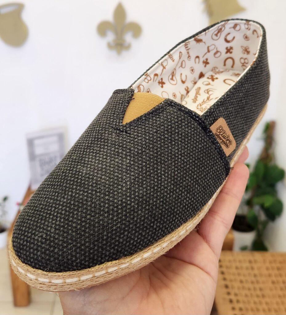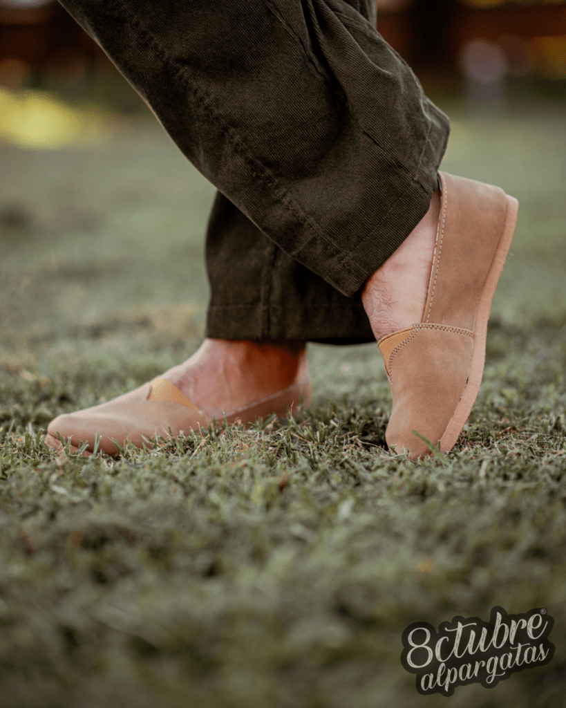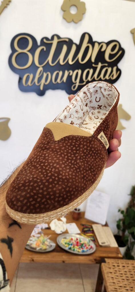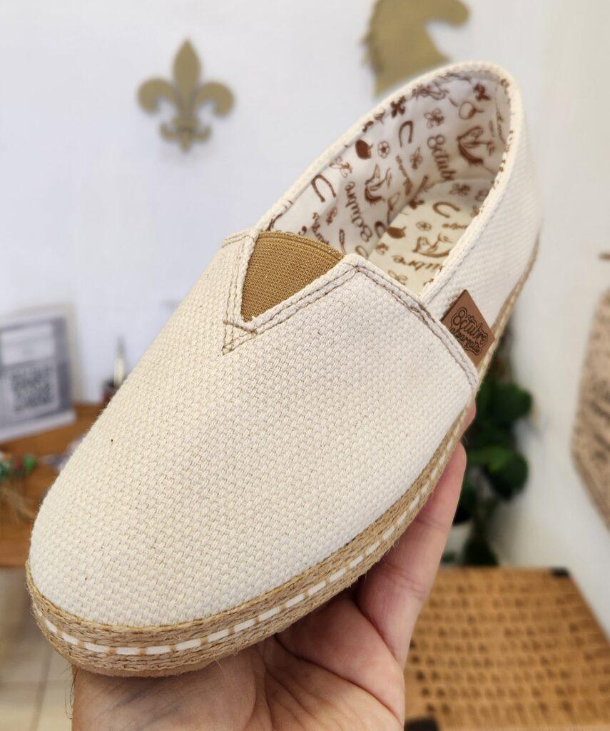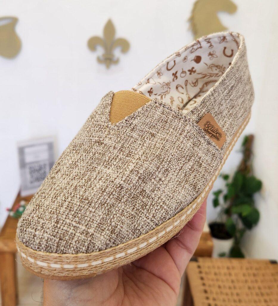 Capellada símil Carpincho con Sarga algodón en capellada y forrada con brin 250 algodón el la caña , base de caucho-Eva 11mm con 3mm de puro caucho en la base grabada, plantilla cromo orgánica, plantilla interior Eva con pique forrada en algodón de 3,5 mm, elástico reforzado de 4 cm, yute de 10mm.